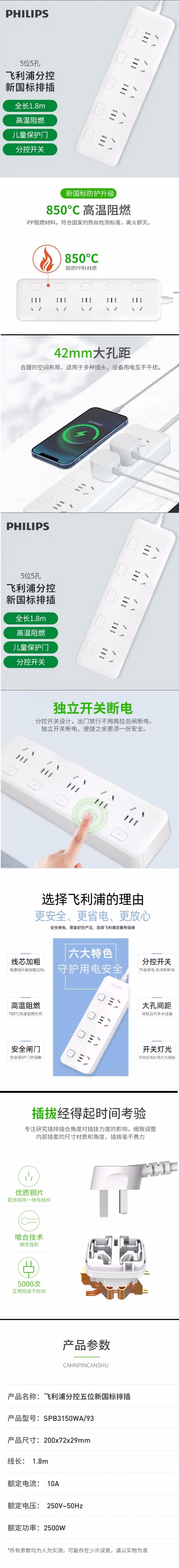 飞利浦新国标安全插座 5位分控独立开关1.8米 大孔位间距