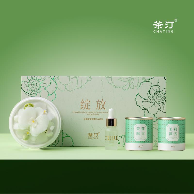 绽放非遗手捏白莲陶瓷花香薰茉莉飘雪茶叶套装
